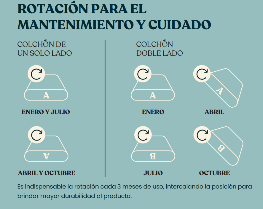 Es fundamental rotar el colchón cada 3 meses, alternando su posición para garantizar mayor durabilidad: